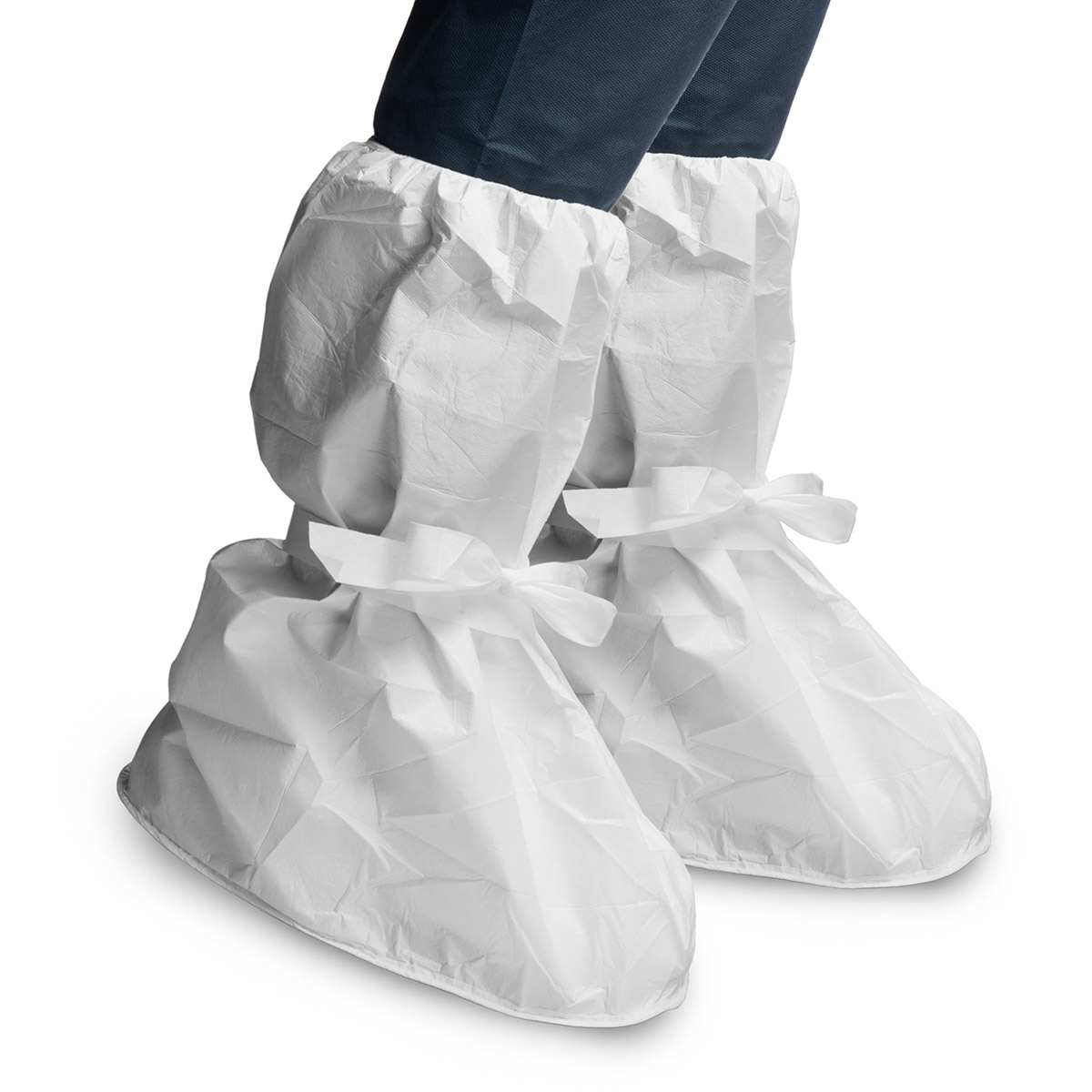 Gambali monouso in laminato 67 g/m2, elastico all'apertura e alla caviglia, 35x40 cm, suola antiscivolo, rilascio particellare testato.
